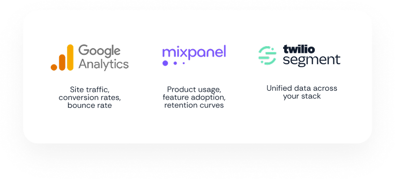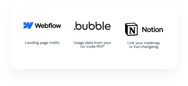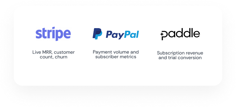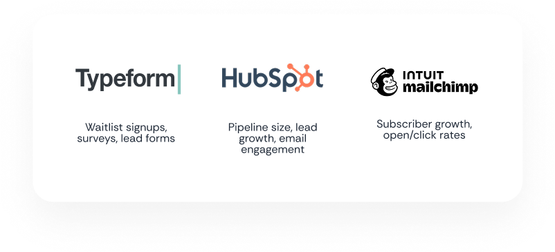 Connect Stripe, Google Analytics, Typeform, and more to pull in the metrics that matter most, like revenue, traffic, or signups. Your data updates automatically, so the whole team can focus on growth instead of reporting.